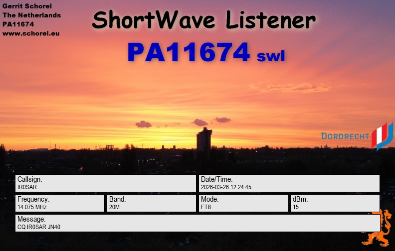 | Mar 26 12:25:37 | -11 | 0.6 | 14080995 | 20M | CQ PD7RF JO22 | PD7RF | FT4 | |||||