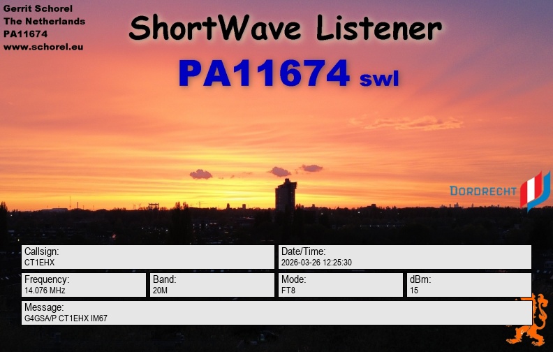 | Mar 26 12:25:30 | -6 | 0.1 | 14075589 | 20M | G4GSA/P CT1EHX IM67 | CT1EHX | FT8 | |||||